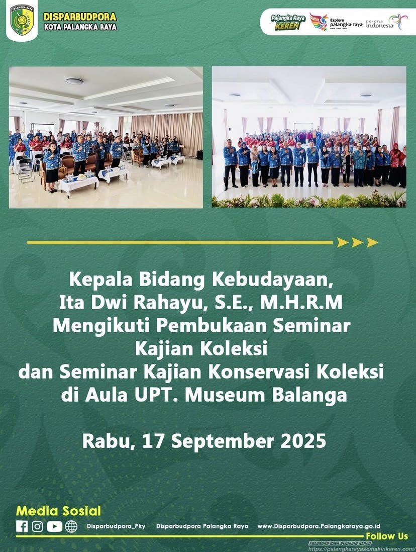 Palangka Raya Semakin KEREN – Dinas Pariwisata, Kebudayaan, Pemuda dan Olahraga (Disparbudpora) Kota Palangka Raya melalui Bidang Kebudayaan menyelenggarakan Seminar Kajian Koleksi dan Seminar Kajian Konservasi Koleksi yang berlangsung di Aula UPT Museum Balanga, Rabu (17/9/2025).