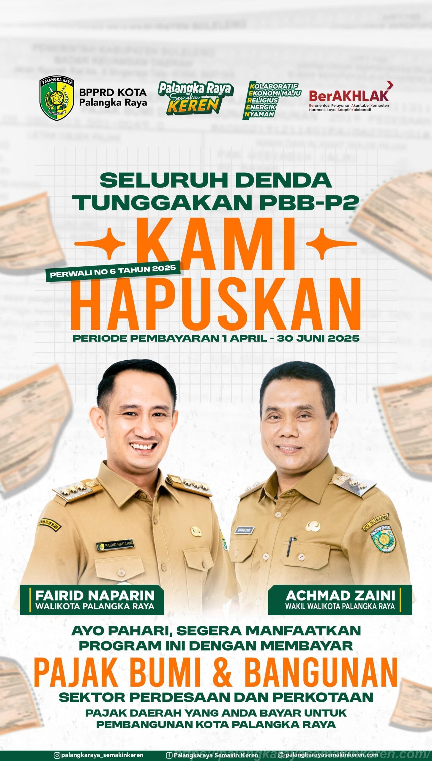 PALANGKA RAYA SEMAKIN KEREN, Palangka Raya – Kabar gembira bagi masyarakat Kota Palangka Raya! Pemerintah Kota secara resmi menghapus denda Pajak Bumi dan Bangunan (PBB) hingga akhir Juni 2025. Kebijakan ini hadir sebagai wujud kepedulian Pemko terhadap kondisi ekonomi warga pasca-Lebaran dan di tengah fluktuasi harga kebutuhan pokok.