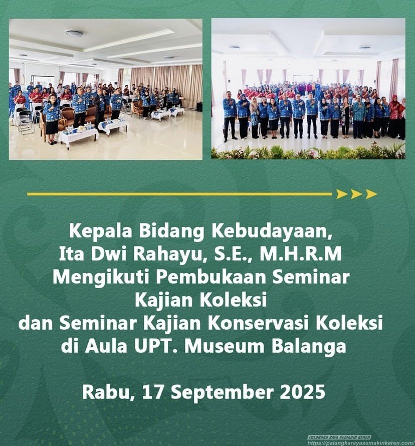 Palangka Raya Semakin KEREN — Kepala Bidang Kebudayaan Dinas Pariwisata, Kebudayaan, Pemuda, dan Olahraga (Disparbudpora) Kota Palangka Raya, Ita Dwi Rahayu, S.E., M.H.R.M, menghadiri kegiatan Pembukaan Seminar Kajian Koleksi dan Seminar Kajian Konservasi Koleksi yang diselenggarakan di Aula UPT Museum Balanga, Pada Tanggal 17 September 2025 Palangka Raya.(Kamis,23/10/25)