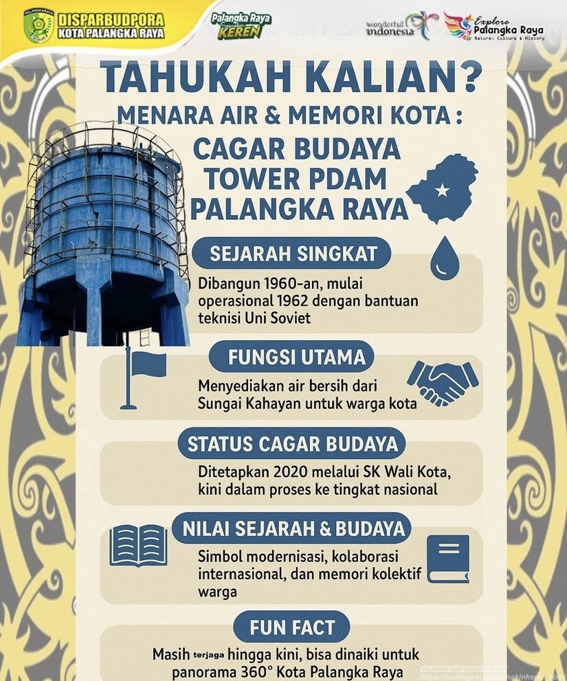 Palangka Raya Semakin KEREN – Menara Air PDAM Palangka Raya, yang telah berdiri sejak awal tahun 1960-an, kini menjadi salah satu cagar budaya penting di Kota Palangka Raya. Menara yang mulai beroperasi pada tahun 1962 dengan dukungan teknisi dari Uni Soviet ini bukan hanya berfungsi sebagai penyedia air bersih, tetapi juga menjadi saksi sejarah perjalanan kota.(Senin,15/9/25)