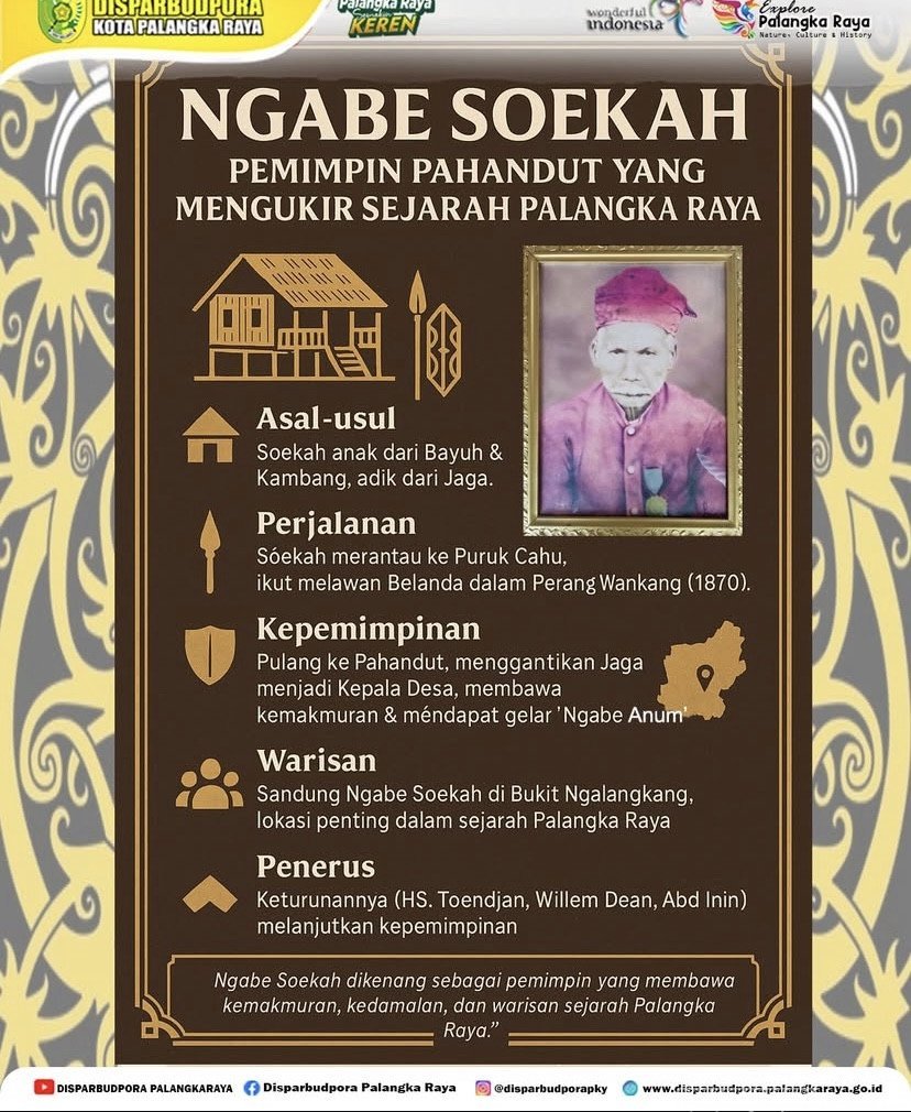 Palangka Raya Semakin KEREN – Nama Ngabe Soekah tercatat sebagai salah satu tokoh penting dalam sejarah berdirinya Palangka Raya. Beliau dikenal sebagai pemimpin Desa Pahandut yang membawa kemakmuran, kedamaian, serta meninggalkan warisan berharga bagi generasi penerus.(Jum’at,12/9/25)