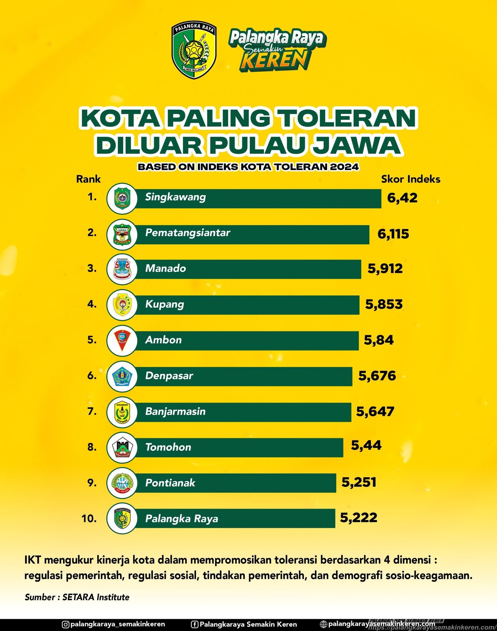 Dalam daftar IKT 2024, Singkawang menduduki peringkat pertama dengan skor 6,42, disusul oleh Pematangsiantar dan Manado. Palangka Raya bersaing ketat dengan kota-kota besar lainnya di luar Pulau Jawa yang juga menunjukkan performa toleransi yang kuat.