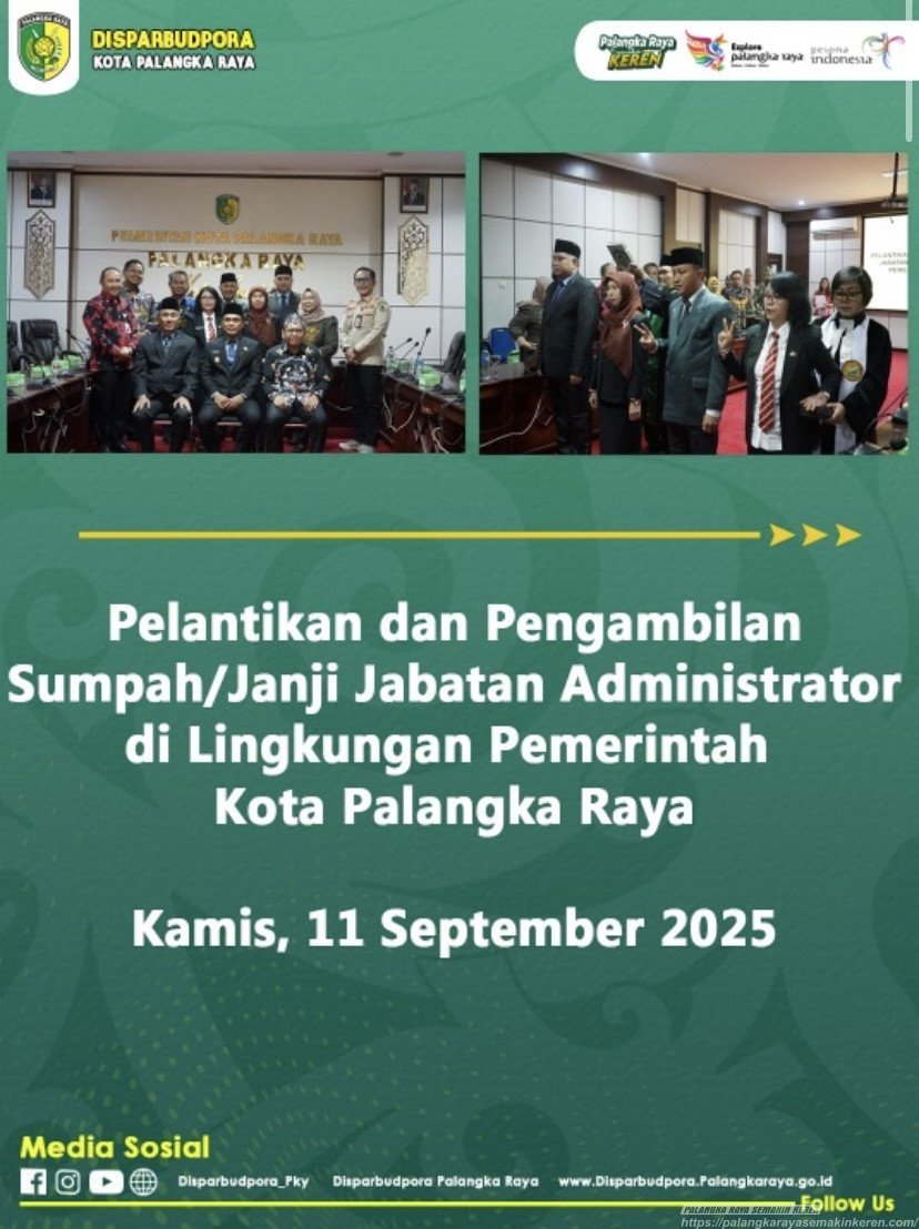 Palangka Raya Semakin Keren – Pemerintah Kota Palangka Raya melaksanakan pelantikan dan pengambilan sumpah/janji jabatan administrator pada Kamis, 11 September 2025. Kegiatan ini menjadi bagian dari upaya penataan birokrasi serta peningkatan kinerja aparatur pemerintahan dalam melayani masyarakat.(Jum’at,12/9/25)