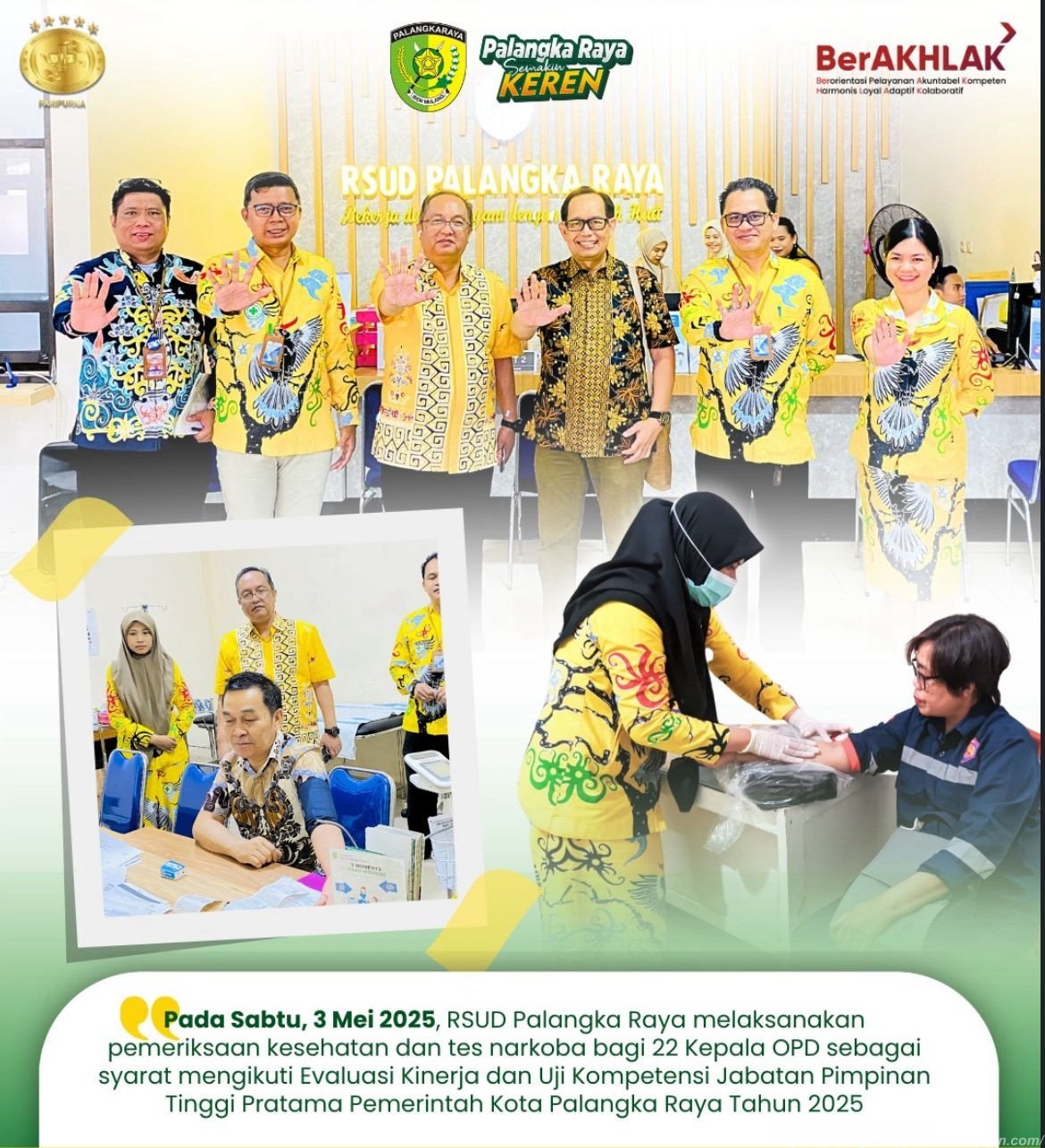 Pemeriksaan tersebut merupakan bagian dari persyaratan dalam Evaluasi Kinerja dan Uji Kompetensi Jabatan Pimpinan Tinggi (JPT) Pratama di lingkungan Pemerintah Kota Palangka Raya Tahun 2025.
